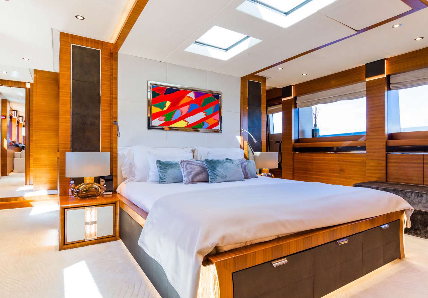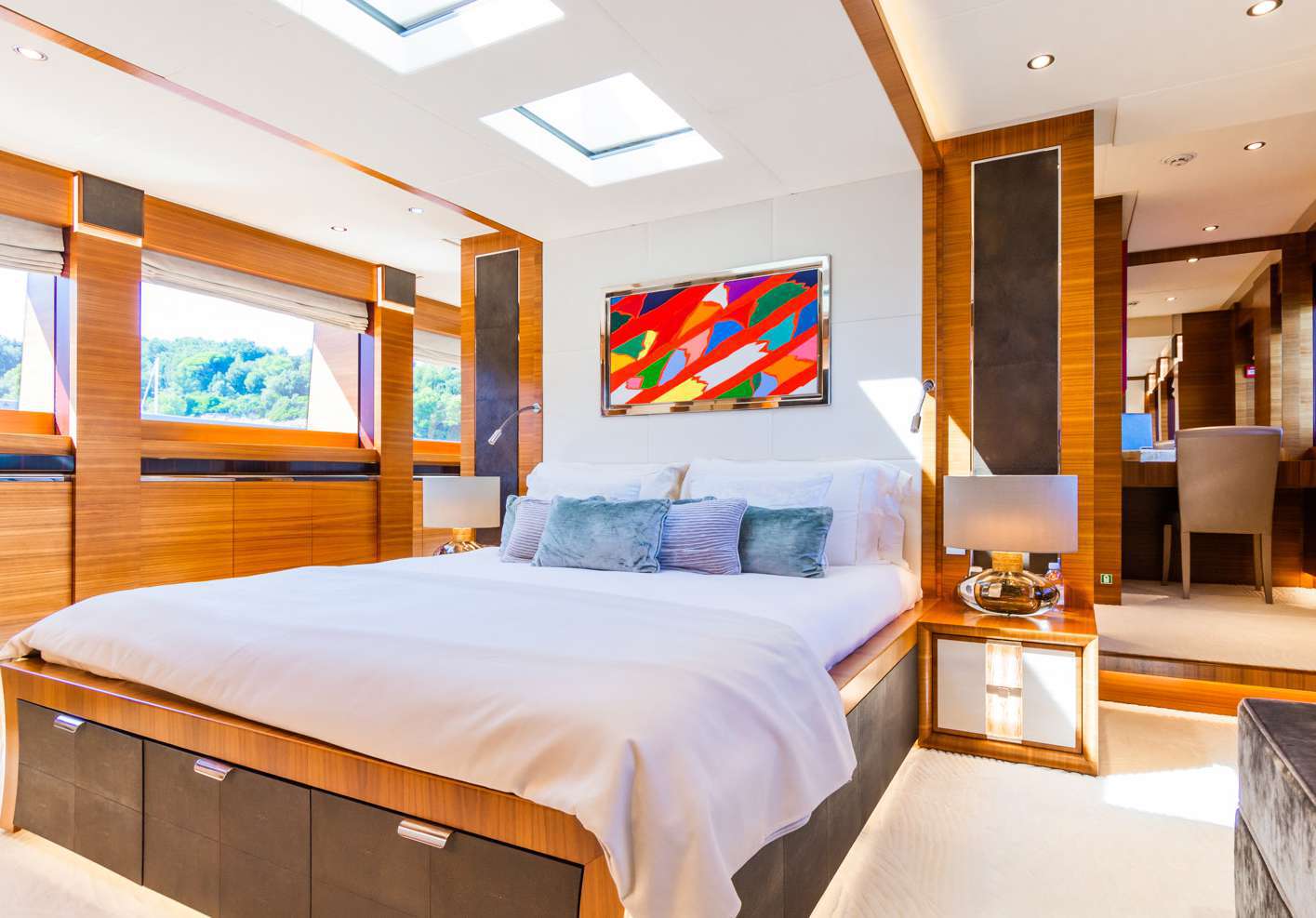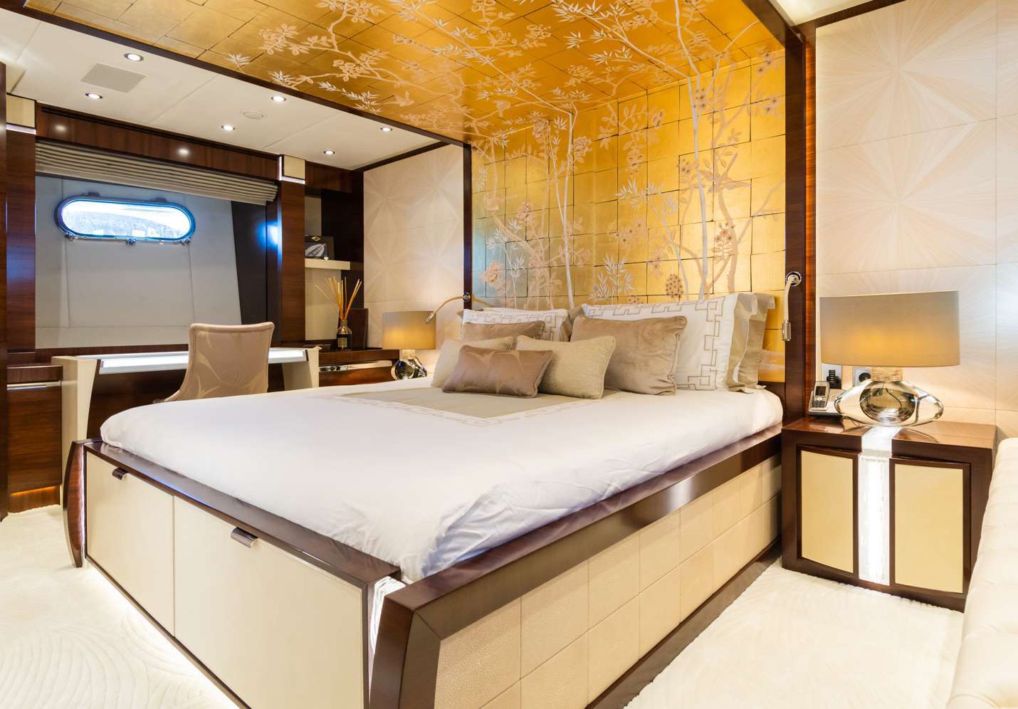 Full-beam main-deck suite with noise-cancellation system, walk-in wardrobe and lavish marble bathroom.