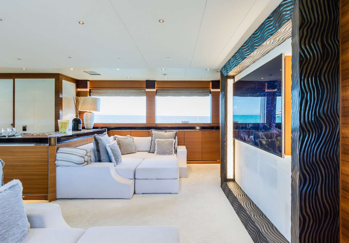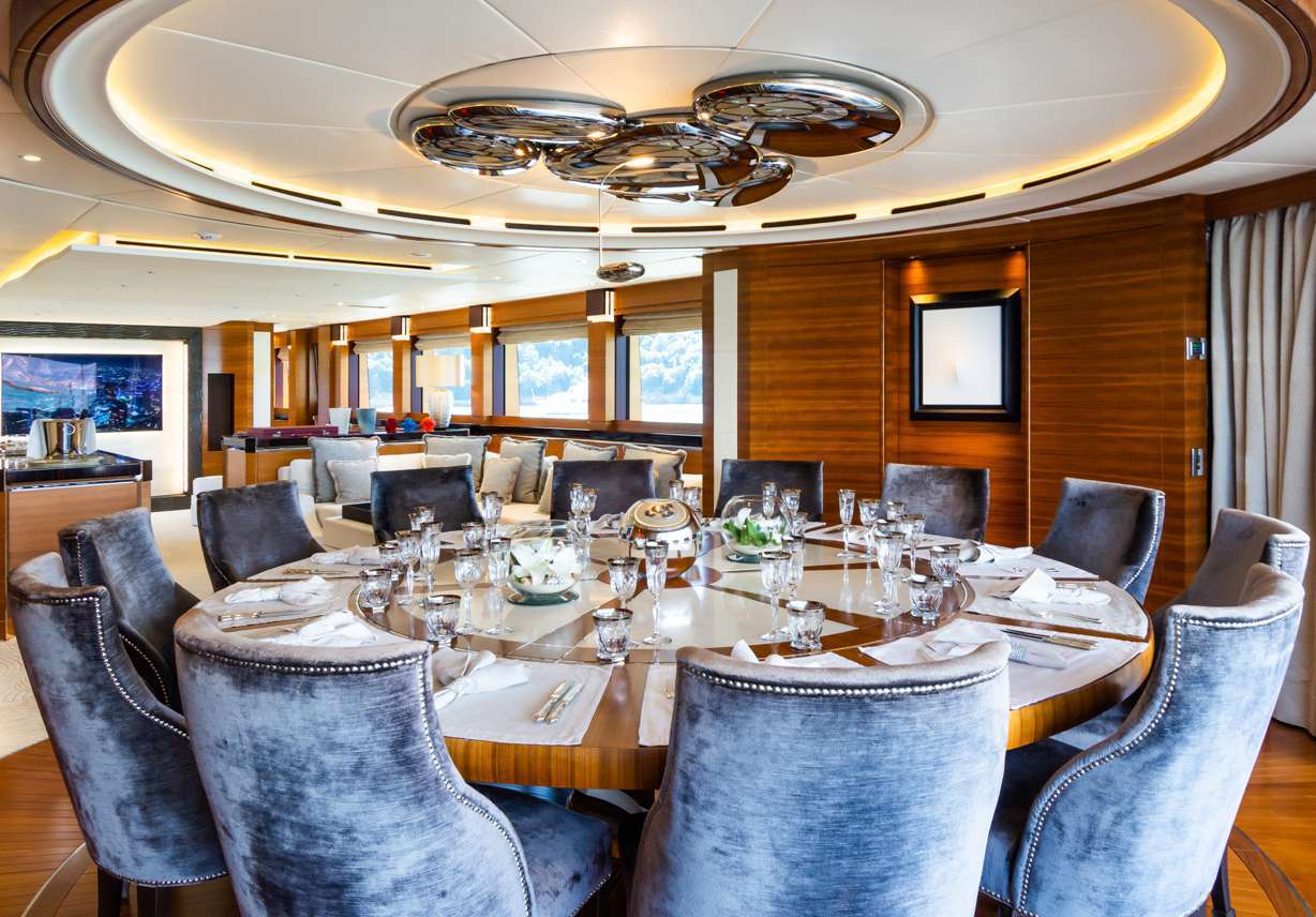 Circular salon table extends from 6 to 12 settings, positioned aft for sea views and privacy.