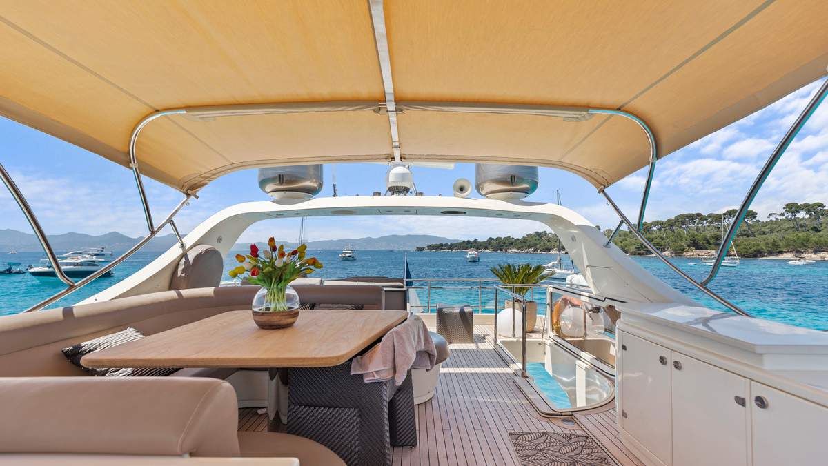 Open-Plan Cockpit – Sun-pad aft, grill & wet-bar, and a retractable awning for long Mediterranean lunches.