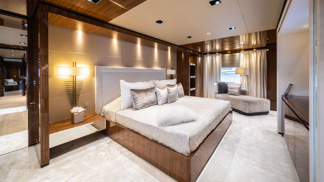 Main-Deck Master: Full-beam suite with walk-in wardrobe and spa-style bathroom.