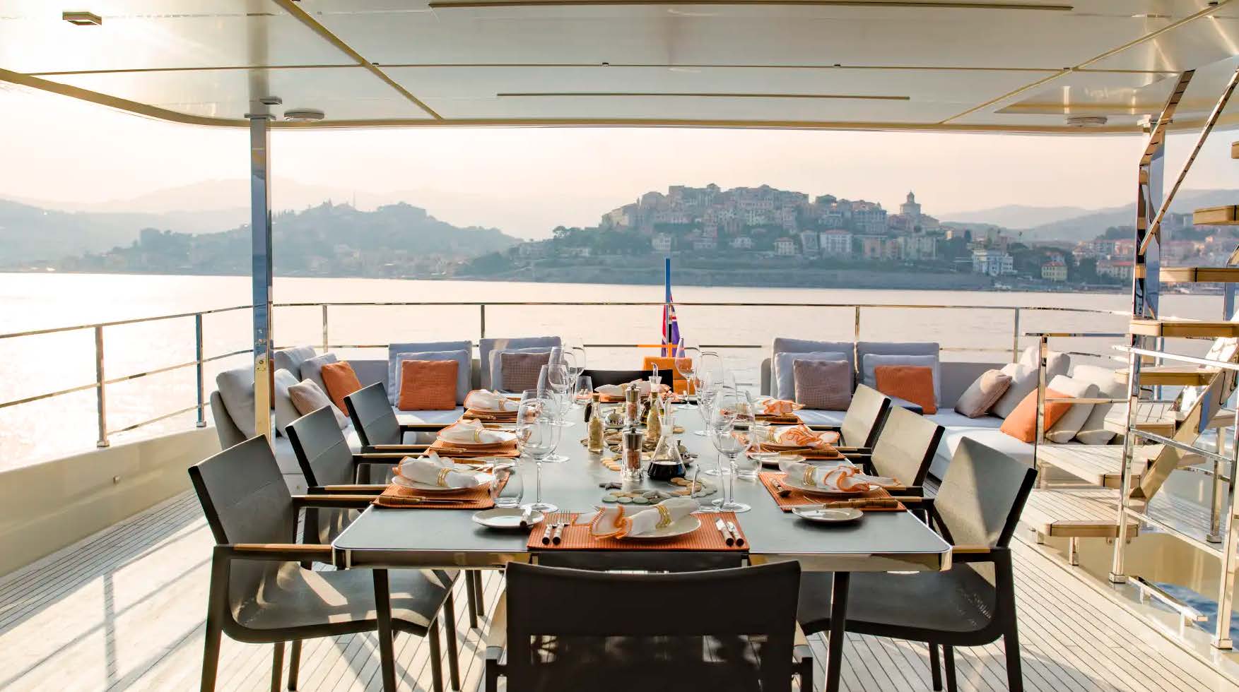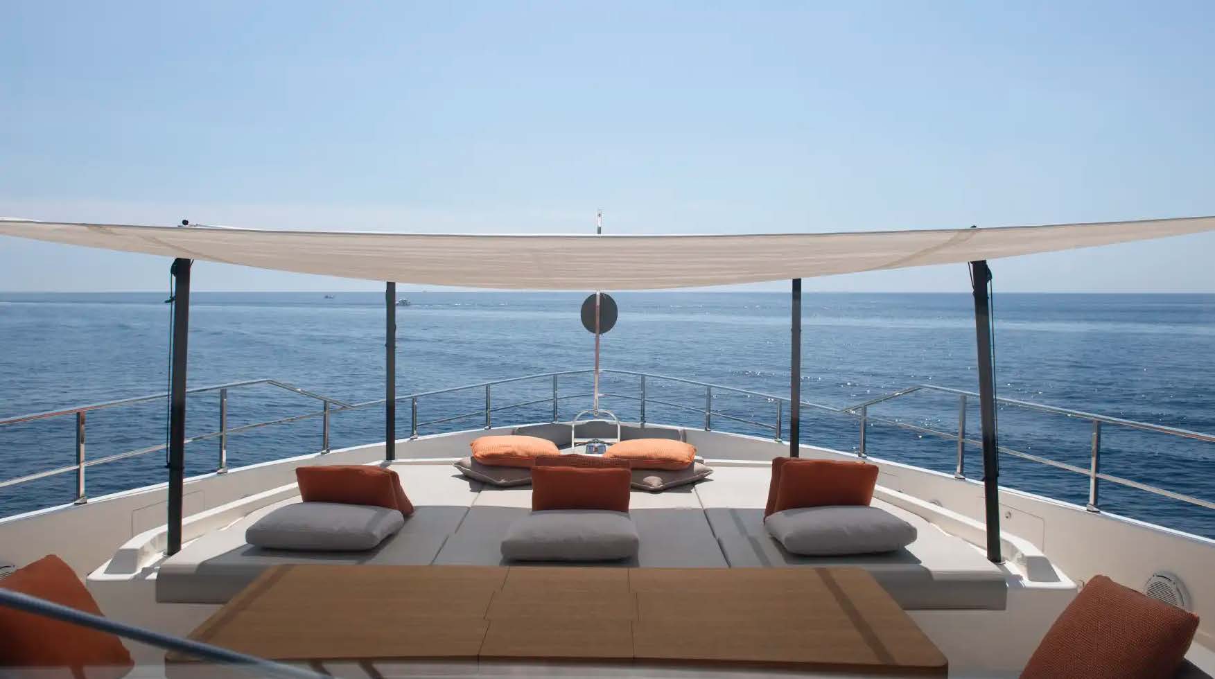 A beautifully proportioned 33-metre yacht, Maria Theresa delivers the space and amenities of a far larger vessel. Five sumptuous suites sleep up to ten guests, while expansive exterior decks invite you to live alfresco: soak in the sundeck Jacuzzi, stretch out on sun-loungers, or enjoy shaded lunches around the raised C-sofa dining table. Aft on the upper deck, a grand table seats the full party for sunset dinners with panoramic ocean views, all prepared by your professional onboard chef. Indoors, the forward master suite and sun-bathed main saloon blend elegant styling with total comfort.